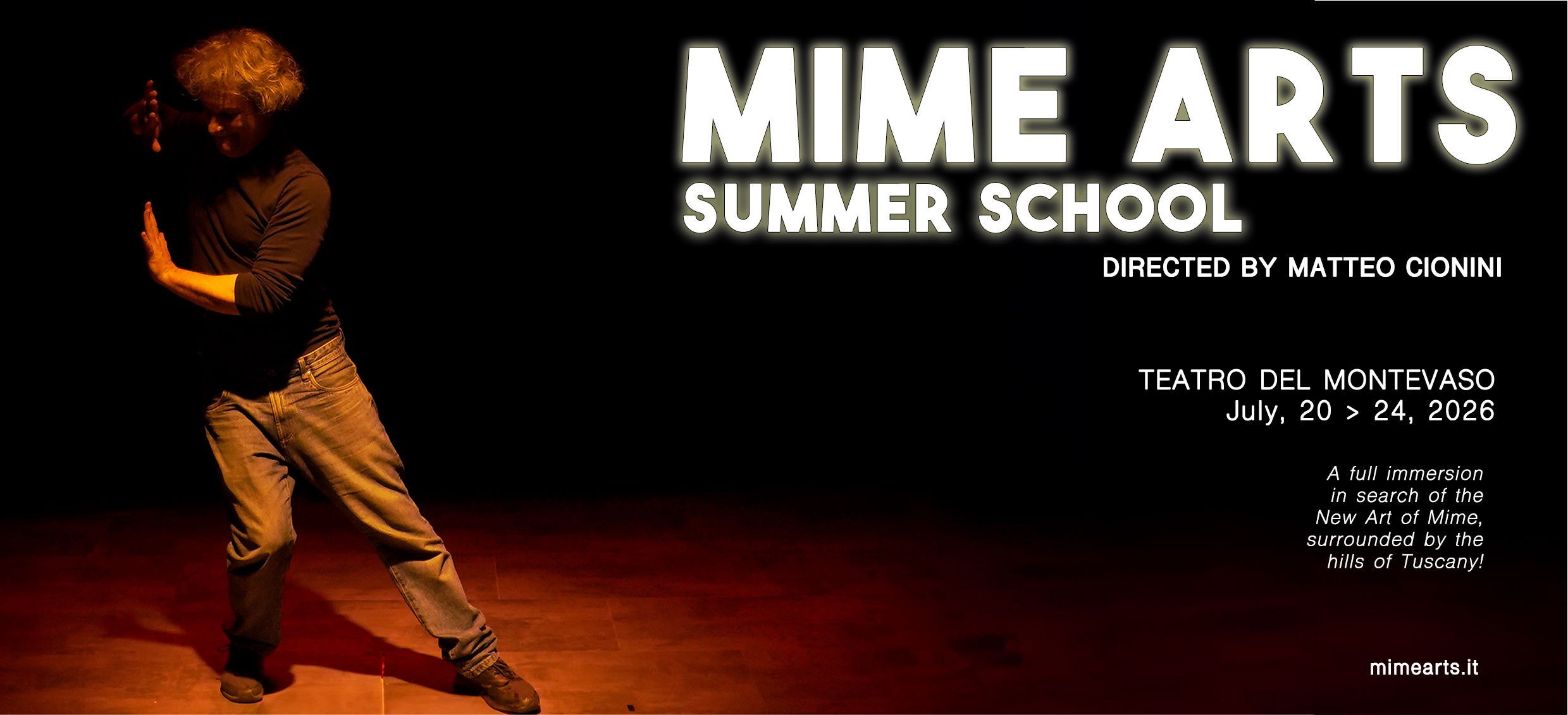 Full immersion residenziale dedicata alle Arti del Mimo, nella splendida cornice delle colline toscane! Sarà una settimana intensiva in cui potrai imparare, consolidare ed esplorare la tua personale Arte del Mimo.
