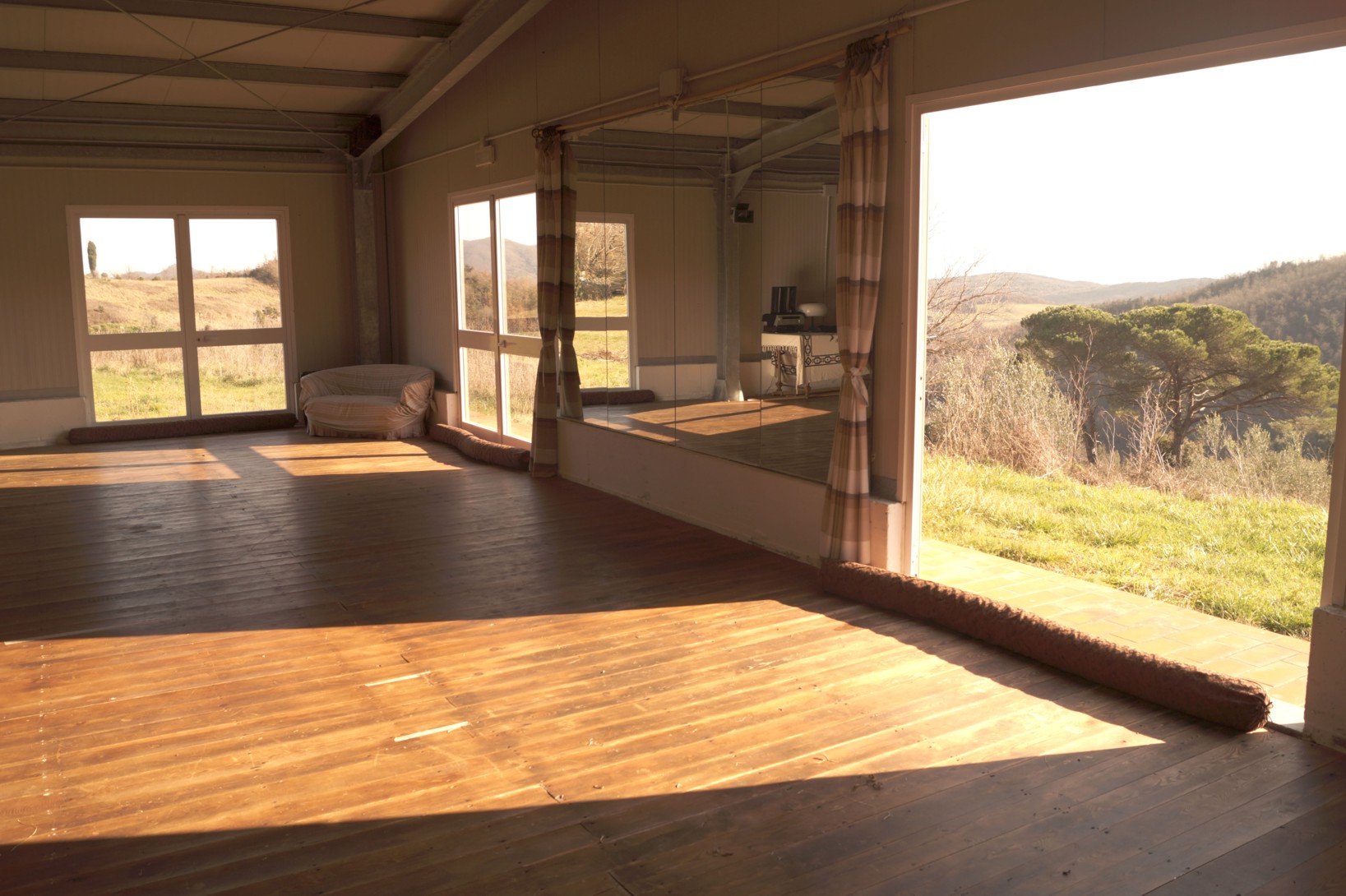 - Una sala teatrale con grandi vetrate, immersa nelle colline toscane.